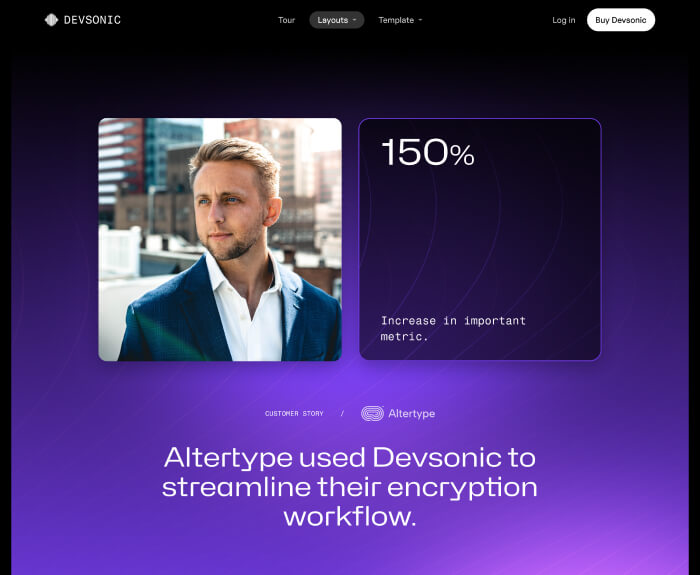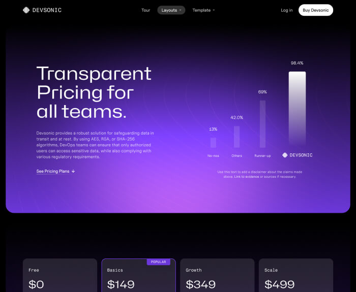 With a wide array of page templates and suite of comparison charts, pseudocode breakouts and testimonials, Devsonic this is the perfect template for your next high-tech enterprise.